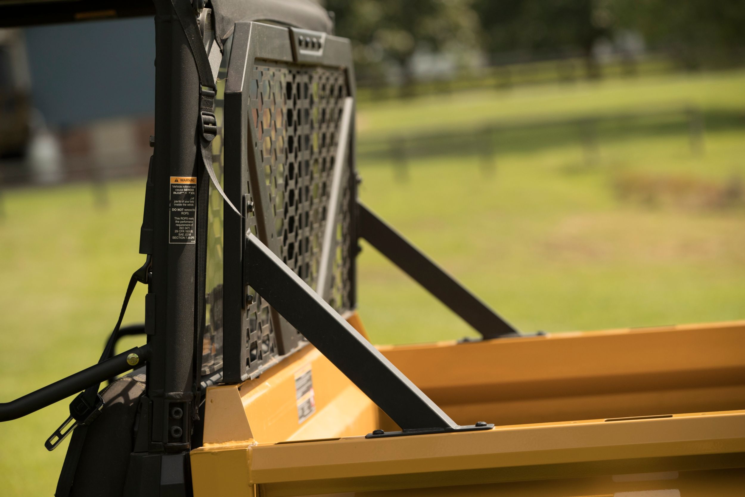 Protects rear window and operator environment from cargo in the bed.