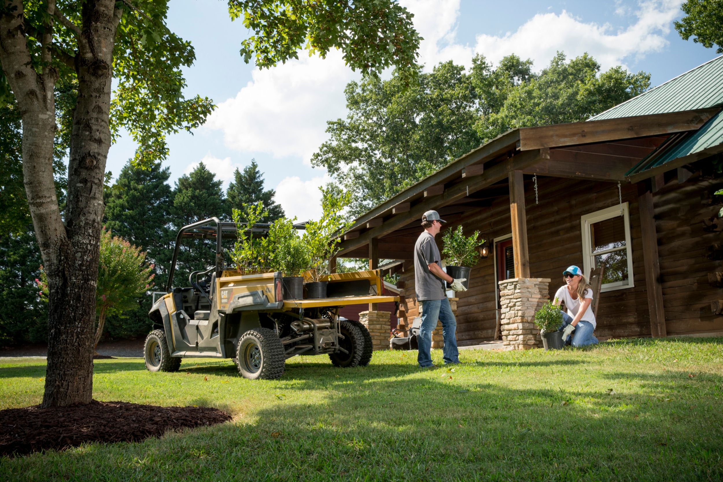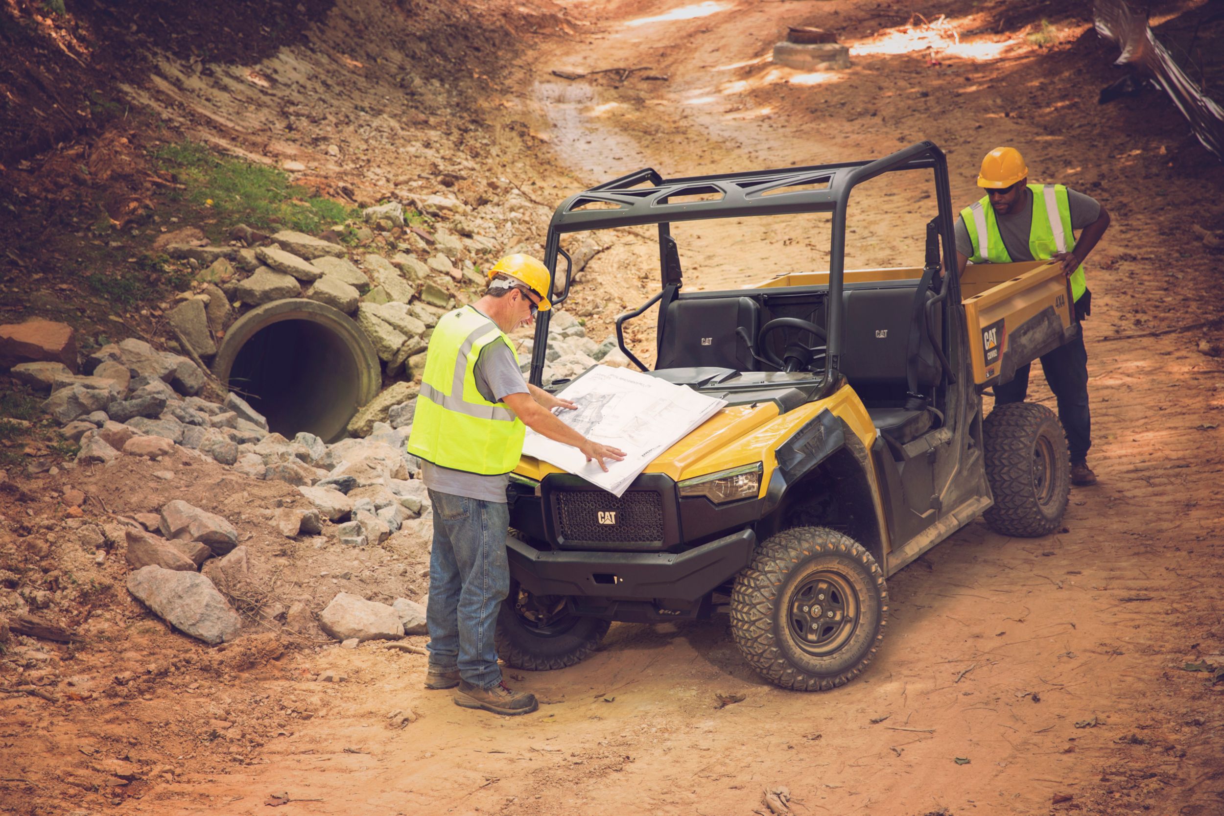 A rugged all steel cargo bed with 453.6 kg (1,000 lb) capacity and integrated tie down points is durably designed to handle a multitude of tasks. Smooth acceleration, clear sight lines and engine braking capability make the Cat® UTV well suited for hauling and towing. They feature a continuously variable transmission, tuned specifically for work applications, offering smooth transitions and the ability to handle loads. Additionally, the choice of two-wheel drive, four-wheel drive or four-wheel drive/lock modes permits the driver to match vehicle drive to ground conditions.