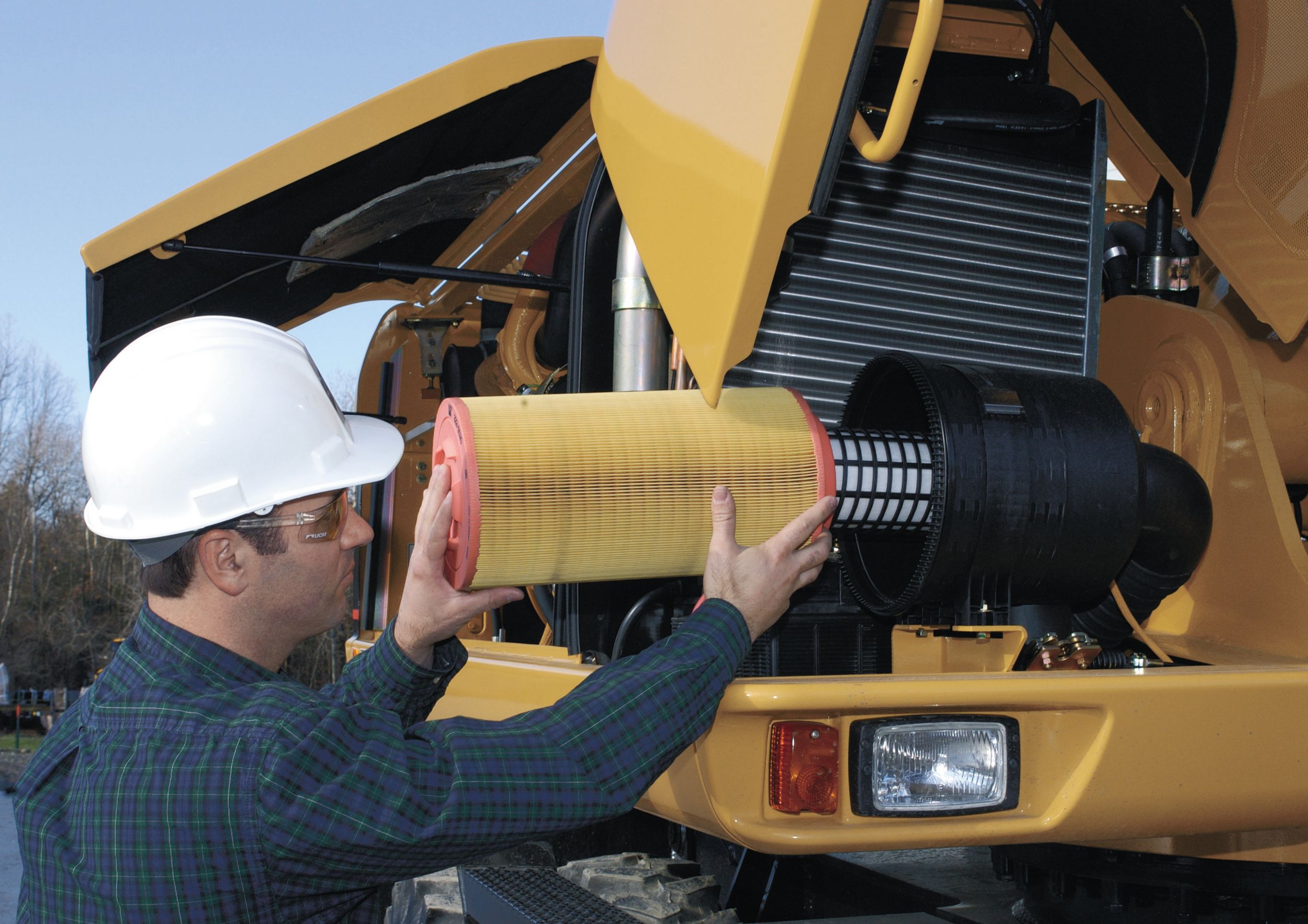 Caterpillar Radial Seal air filters eliminate the use of service tools, reducing maintenance time. The air filter features a double-element construction and built-in precleaner for superior cleaning efficiency. When the air cleaner plugs, a warning is displayed on the monitor screen inside the cab.