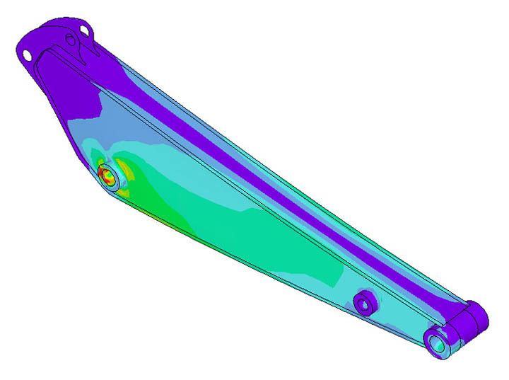With FEA, a more stable and reliable base frame and upper frame structure could be designed. For maximum strength and best range, all linkage parts (boom, sticks) have been analyzed to achieve an optimal balance of weight reduction versus fatigue strength. This also includes the offset boom.