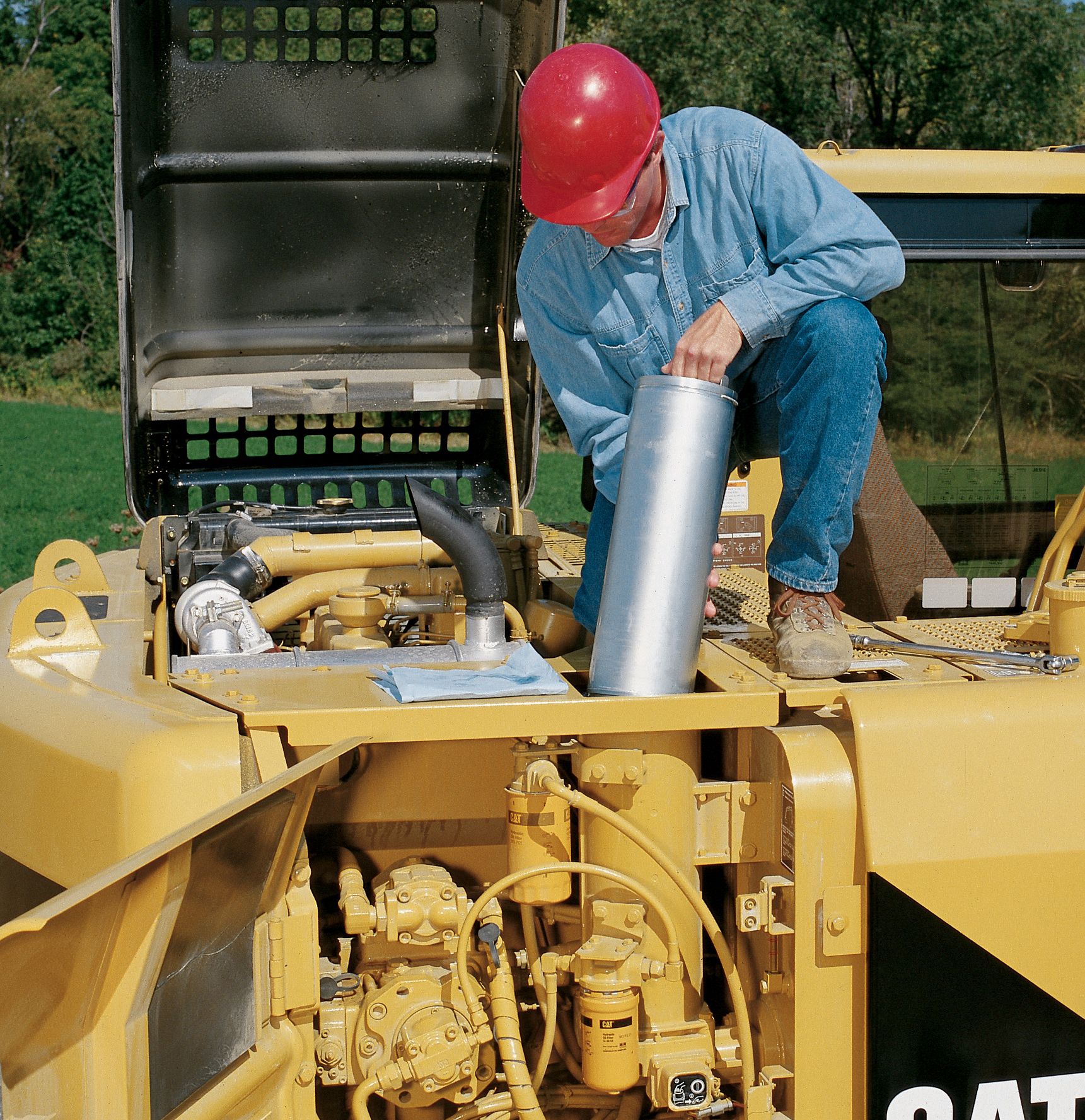 The 311B engine oil filters for the 3064T engine are mounted upside-down on the cab side in the engine compartment for easier access. To minimize oil spillage during removal, the oil in the filter can be drained prior to the filter change.