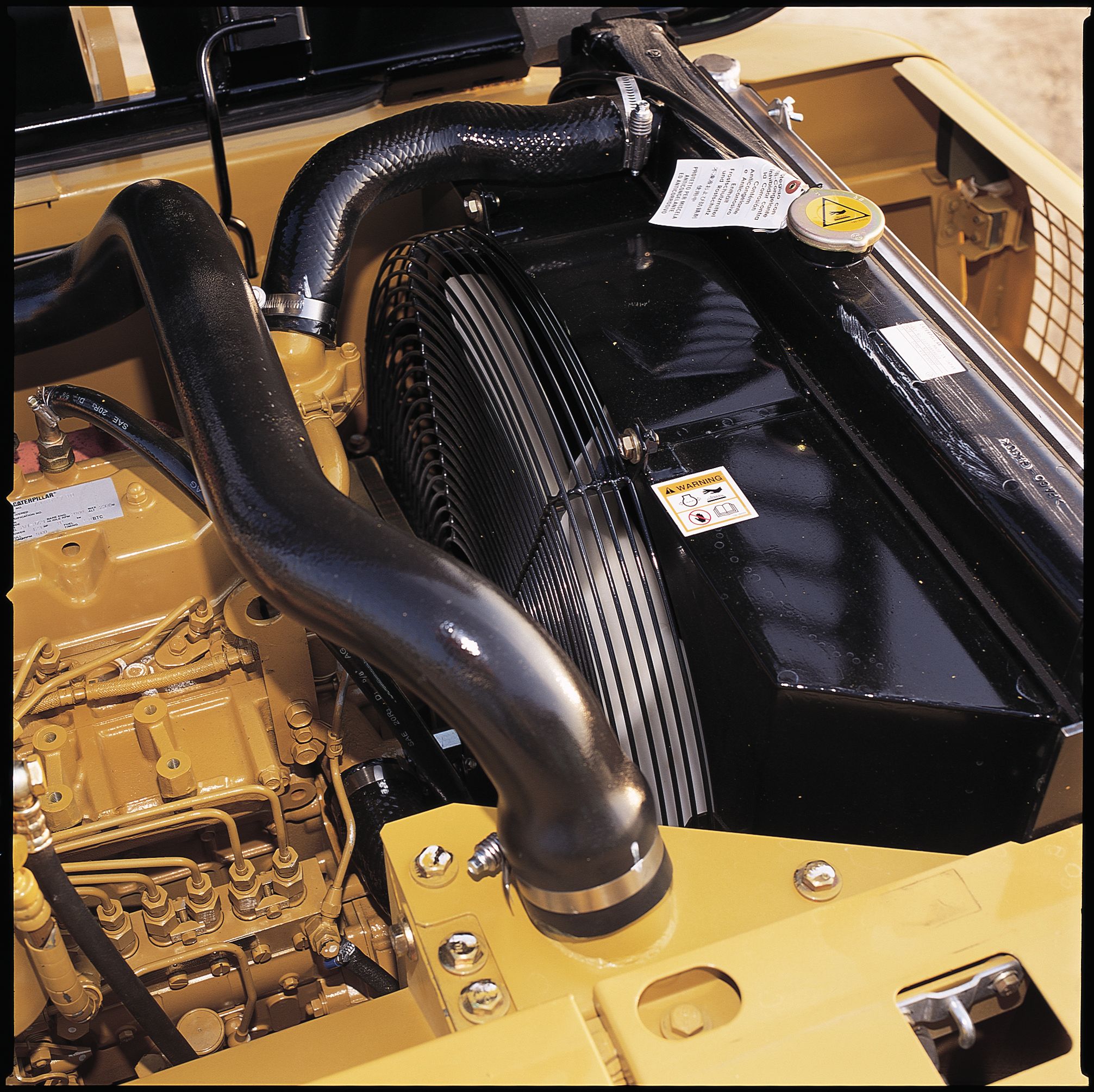 Engine radiator fan is completely enclosed by fine wire mesh, reducing the risk of injury.
