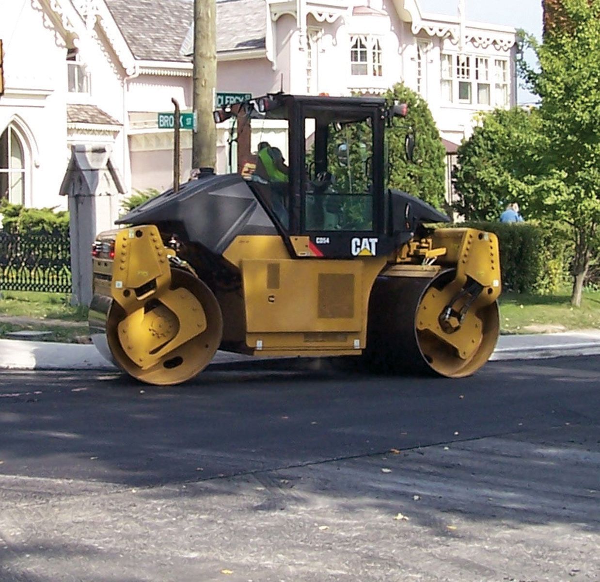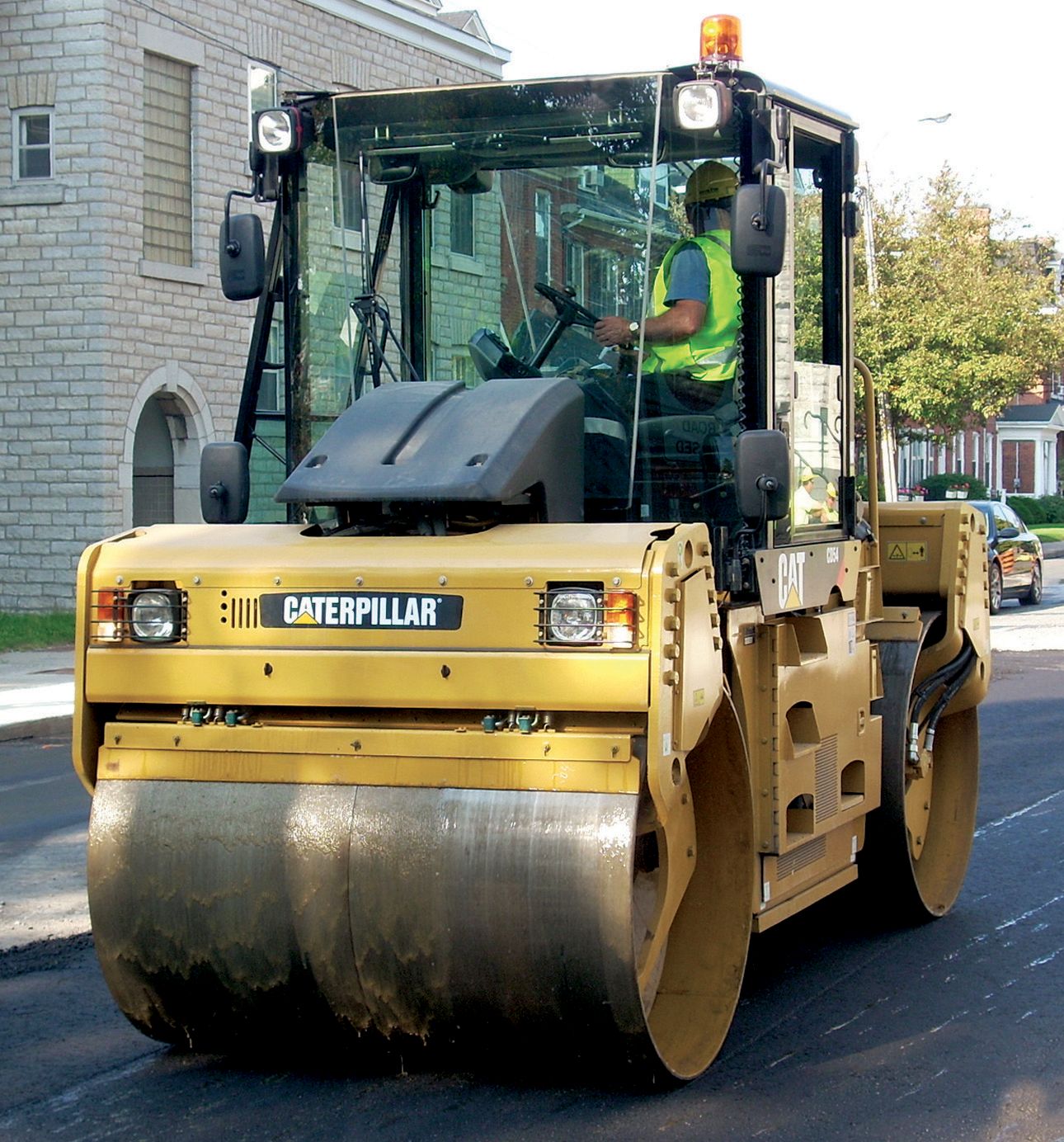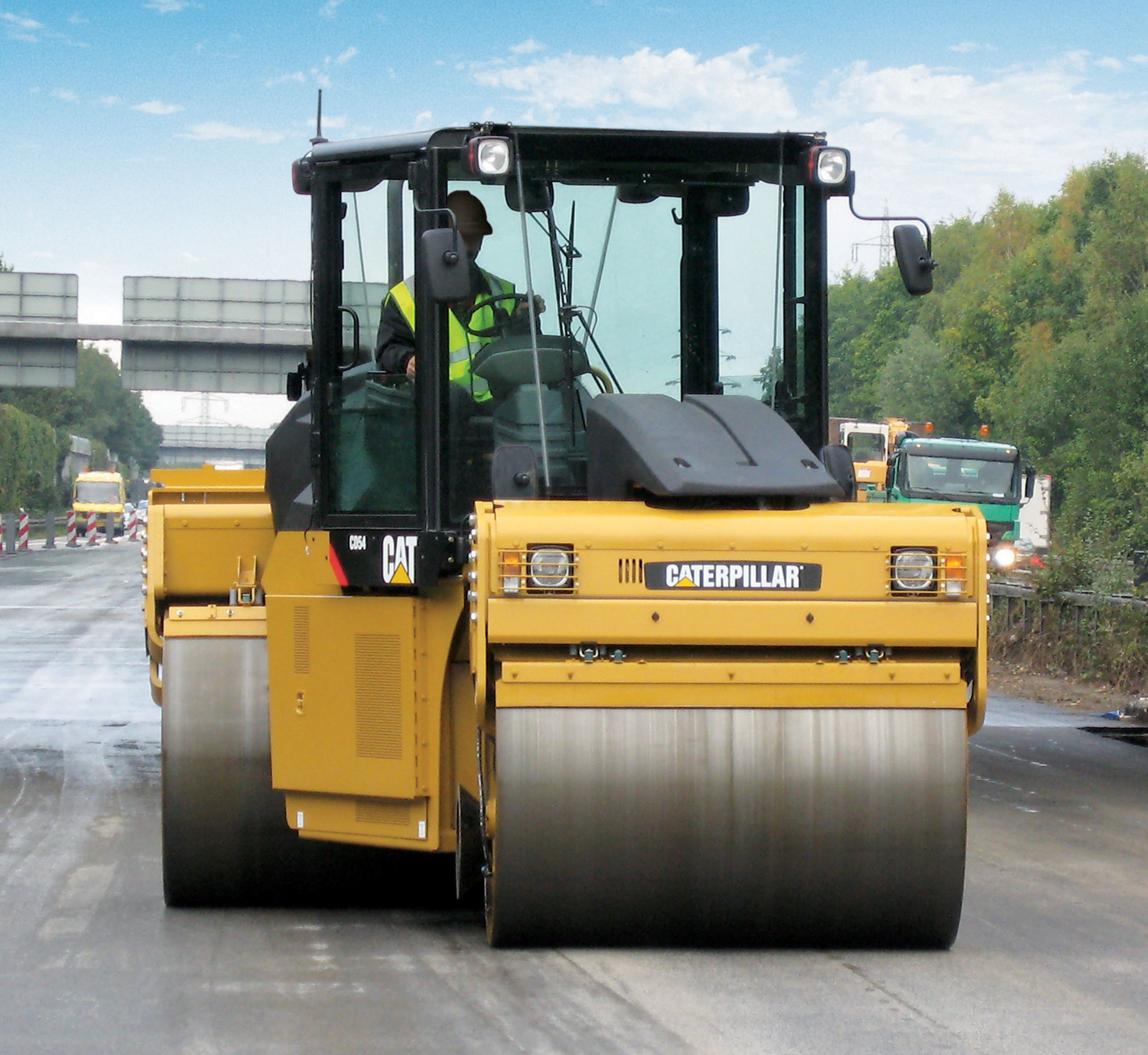 The CD54 Drum Steer Tandem Vibratory Roller offers a versatile vibratory system that is effective on all types of asphalt mix. The front and rear split drums, wide offset feature, optimum maneuverability, power and reliable water spray system deliver unmatched performance in adverse conditions.